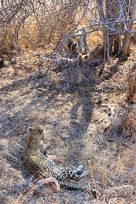 I had a long drive ahead of me, so I left Mbali to carry on feeding, and found a small breeding herd of elephants feeding along the drainage line not 80m from her. As I was leaving the area, I went to see if Kuhanya female leopard was still in the same spot as this morning, and found her as she was walking straight back to the kill, and straight through the herd of elephants that were quite well spread out. Not one of the elephants seemed to notice her, and Kuhanya arrived at the scene of her own kill.