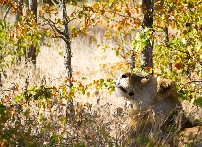 Herold then found the lion pride down at Wisani crossing, they were still following the buffalo herd from yesterday. Following the road towards the crossing, we came across a female giraffe and a small herd of zebra - who unfortunately were in quite thick bush making photos a little tricky. By the time we got to the spot of the lions, they had run off into very thick terminalia bush and I decided it would be more worth while to come back after drinks as there was no doubt that they would continue after the buffalo. After a drinks stop at Xinatsi Dam, where we watched a Steenbok come down to the water to drink as well as Purple-Cheeked Waxbills, Greenwinged Pytilias and Orange Breasted Buntings, we started back towards the area of buffalo and lion. Along the way we passed another small herd of buffalo, sensibly far away from the lion. With some careful maneuvering through Mopane thicket, we found the pride of lion resting up, walking a few meters and lying down again. It would have been great to sit there all day and wait, as the the buffalo were unawarely heading closer and closer. However, by this stage the only thing calling was breakfast and we headed back to camp.